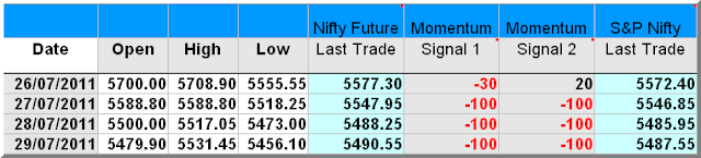 The projected levels of Momentum Signal values applicable to various ranges of closing values of the current month Nifty Futures, Nifty Index and the BSE Sensex, as at the next close, ie. as on 1st August, 2011, are given in the following table. All readers are requested to take note that the table below is just a ready reckoner for the next day's Momentum Signal values and the figures are not intended to be interpreted as any targets for the Nifty futures or indices shown therein.
